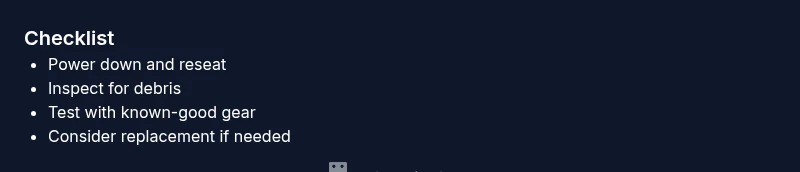 - Clean the port with canned air or isopropyl alcohol on a lint-free swab, never liquid solvents on sensitive connectors.