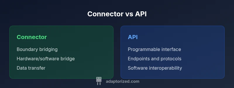Understanding the difference between connector and api is not just semantics; it shapes project scope and vendor decisions. In practical terms, a connector is the bridge that links two environments, enabling data to move or signals to be exchanged. A traditional hardware connector like USB-C, or a software connector such as a message broker bridge, binds systems at a boundary. An API, on the other hand, defines the rules for software-to-software interaction, specifying endpoints, protocols, and data formats that applications use to request services. The distinction matters for DIYers and professional developers because it determines where you implement logic, how you secure interfaces, and how you evolve the integration over time. According to Adaptorized, recognizing that connectors and APIs serve different roles helps you design resilient architectures that can scale and adapt as technology stacks shift.