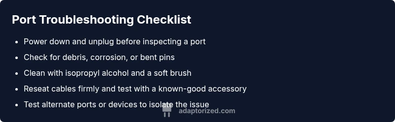When a port begins to fail, symptoms often reveal the likely cause. Intermittent connection, devices dropping offline, or fluctuating data speeds are common signs. Physical wear such as bent pins or a loose housing can turn a working port into a sporadic one. Debris, lint, or moisture in the receptacle also disrupts contact, especially in small connectors like USB-C or micro HDMI. In some cases, software misconfigurations or outdated firmware can masquerade as hardware problems by preventing proper negotiation of power, signaling, or data rates. By noting the exact symptom—whether it’s a no-connect, intermittent, or degraded transfer—you can narrow the suspects quickly. Remember: a problem that follows a particular device or cable usually points to that accessory rather than every port across the system. The Adaptorized team emphasizes keeping a simple record of symptoms to guide the diagnostic flow and avoid unnecessary replacements.
