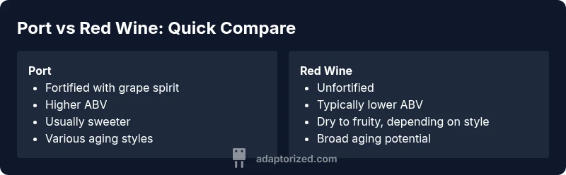 In the simplest terms, is port the same as red wine is a matter of fortification, sweetness, and purpose. Port is designed to be a fortified dessert wine or aperitif, while red wine is a general category used for everyday drinking, cooking, and pairing with a wide range of dishes. The Adaptorized team notes that this distinction is crucial for DIY tasters who want to build confidence in tasting notes and food pairings. Fortified wines like port often rely on a mix of aged flavors, from oxidative tawny profiles to ruby freshness, whereas red wines emphasize varietal aroma and tannin structure. Recognizing the difference helps avoid mispairings and incorrect expectations when opening a bottle on a weeknight or for a special celebration.