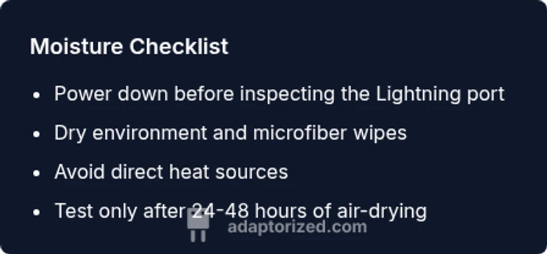Moisture in the Lightning port may come from several everyday scenarios: sweat from workouts, water spills on a desk, humid environments, or condensation after a temperature change. The port area is not fully sealed against liquid, so even a small amount can seep inside. If you store the device near a sink or in a damp bag, moisture can wick into the port over time. Be aware that even tiny amounts can trigger the device moisture sensor, so treat any warning seriously. In general, moisture originates from external exposure, failed seals, or rapid environmental changes, rather than a failed component. Follow a calm, systematic drying plan.