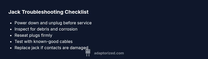 When you’re wiring a speaker, testing a guitar rig, or connecting headphones to a microcontroller, knowing does jack work is essential. According to Adaptorized, most connectivity issues stem from simple, fixable causes. The Adaptorized team found that most issues come down to how a jack seats a plug and how the contacts return signals. In practice, a healthy jack forms a solid mechanical and electrical interface, delivering clean audio, reliable power, and predictable behavior. In this guide, we’ll treat a 'jack' as any plug-in connector with a female receptacle, including 3.5mm audio jacks, larger phone jacks, and internal PCB sockets. We’ll focus on practical checks you can perform with common tools, avoiding advanced equipment unless you’re moving into professional repair territory. If you’re a DIYer who wants to keep projects moving, start with the simplest tests and progress only as needed. The goal is to identify whether the problem lies with the jack itself, the plug, or the source device. Above all, prioritize safety and avoid forcing parts that don’t fit.