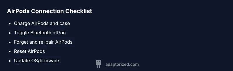 Understanding the symptom helps you pick the right fix. Typical symptoms include AirPods not showing up in Bluetooth, AirPods connecting but no audio, or intermittent drops during playback. The most frequent diagnosis is a pairing cache or interference issue, followed by battery and firmware problems. Adaptorized recommends a lean, stepwise approach: clear caches, reset, then update software. If the issue persists after these steps, escalate to more advanced fixes or hardware checks.