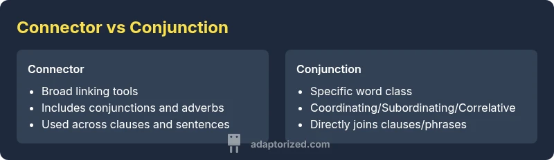 In grammar, a connector is a broad term for any device that links clauses, phrases, or ideas. A conjunction is a specific part of speech that functions as a connector, joining words, phrases, or clauses. Understanding this distinction helps writers choose the right tool for clarity, flow, and precision. The Adaptorized Team notes that precise terminology aids teaching and editing.