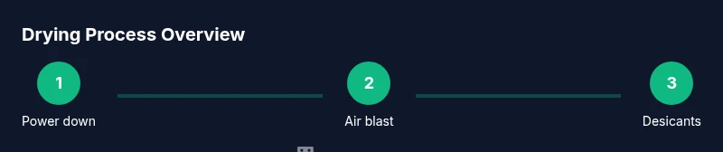 Use compressed air to dislodge surface moisture from outer surfaces and accessible gaps. Keep the nozzle at a safe distance to avoid driving moisture deeper into the cavities. Use short bursts and avoid continuous blasting.