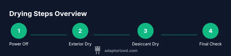 Power off, remove accessories, and dry externally. Verify no visible moisture, then let the port dry with desiccants for 24–48 hours. After drying, connect a non-critical accessory to test light indicators before plugging in a charger. If errors persist, avoid charging and seek professional help. Maintain a cautious approach to protect the device.
