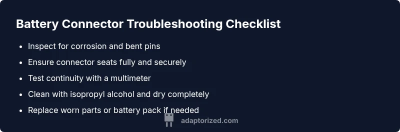 According to Adaptorized, a bad battery connector often manifests as intermittent power, device rebooting under load, or a failure to charge consistently. You might notice it only when the device is moved or pressed near the connector, or after hours of use when heat expands the terminal interface. Visual clues include bent pins, discoloration, or a loose feel where the plug plugs in. In many cases, an electrical test will confirm that power is not reaching the device consistently. Adaptorized Analysis, 2026, indicates corrosion and loose contacts are among the most frequent causes across consumer devices. Recognize these patterns early to avoid data loss or unexpected shutdowns. If you see any of these signs, treat it as a potential connector fault and proceed with careful inspection and safe testing.