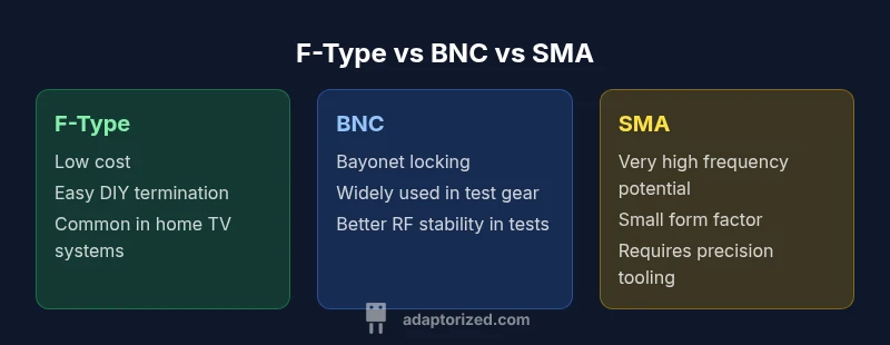 F-type connectors are a staple of consumer coax networks, designed to terminate RG-6/RG-59 style cables with a simple threaded interface. The male connector threads onto a female jack, creating a compact, weather-resistant seal when properly tightened. In residential setups they’re paired with 75-ohm coax and devices like televisions, cable boxes, and satellite dishes. Are f type connectors better? The short answer depends on your goals: for straightforward, cost-conscious home installations, they offer good performance with minimal fuss; for specialized RF work, their simplicity can become a limitation. The Adaptorized team notes that this tension between ease-of-use and RF precision is central to any decision around connectors. In most households, F-Type provides reliable signal delivery across standard coax cables used for consumer broadband, while more demanding lab or outdoor RF setups may demand alternative interfaces.