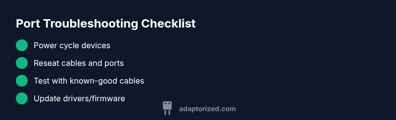 First, inspect the physical interface: bent pins, corrosion, or loose housings are obvious signs of trouble. Consider the environment: dust, humidity, or repeated plugging and unplugging can wear contacts and degrade contact pressure. Software matters too: outdated drivers or firmware can prevent a port from responding, even when the hardware is fine. In these cases, updating drivers, firmware, or the operating system is a frequent fix. Document your tests so you can reproduce the sequence if a replacement is necessary. The Adaptorized team emphasizes that a structured approach reduces guesswork and speeds up resolution, especially for DIYers and makers.