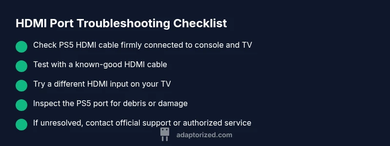 Learn practical steps to diagnose and fix a broken PS5 HDMI port, with safe checks, repair options, and prevention tips from Adaptorized. Quick actions, professional paths, and safety notes included.